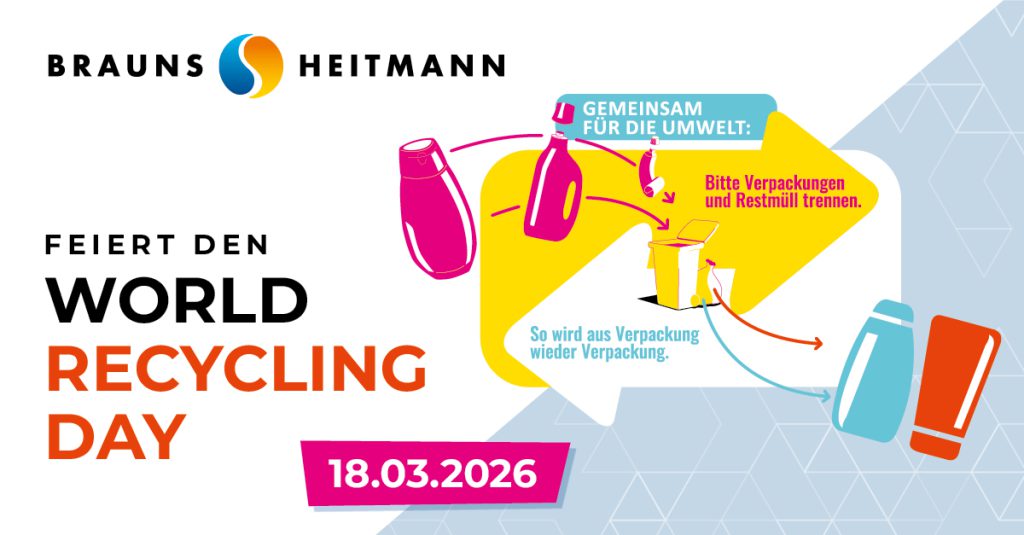Bei Brauns-Heitmann verwenden wir das sogenannte Post-Consumer-Rezyklat (PCR). PCR wird aus den Kunststoffabfällen von Haushalten, Industrie und Gewerbe gewonnen. Es wurde also benutzt, ins Recycling gegeben und dann in neuer Form wiederverwendet. So schont es die Umwelt und trägt zum Klimaschutz bei! Seit 2019 bauen wir den Rezyklat-Anteil in den Kunststoffflaschen unserer Marken kontinuierlich aus. Heute bestehen zum Beispiel alle Flaschen der HEITMANN-pure-Serie aus mindestens 97 Prozent Rezyklat. Nach der Verwendung können die leeren Rezyklatflaschen in die Wertstoffsammlung gegeben werden und bleiben damit Teil der Kreislaufwirtschaft.